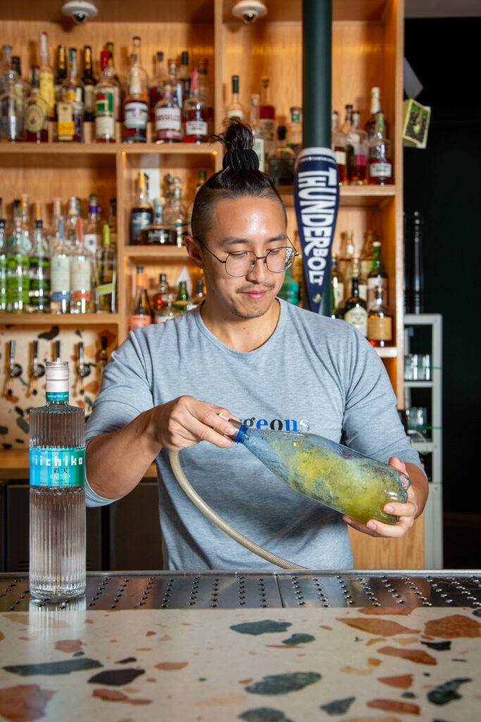 Liu became acquainted with shochu brand iichiko while working at the now-closed LA location of the NoMad Hotel, and not long after he landed at Thunderbolt, he sought to showcase it in a cocktail that’s now featured in the “Culinary Adjacent” section of the bar’s newly revamped menu: Called the Fu Gwaa Falsetto, it’s essentially a “bitter-melon Swizzle” that showcases the fruit and the distinct umami character of iichiko’s Saiten expression alongside Oaxacan rum and Manzanilla Sherry, among other ingredients (he laughs while noting that many Asian guests share their polarizing memories of bitter melon as children, adding that it typically makes a much better impression on their adult palates). “As I delved into [shochu] more and saw how it’s made from so many raw materials, [I realized] it’s such a pure expression of [those materials],” says Liu. “And because there are so many different categories, there are so many different ways to play around [with it]. It meshes well with a lot of different spirits.”